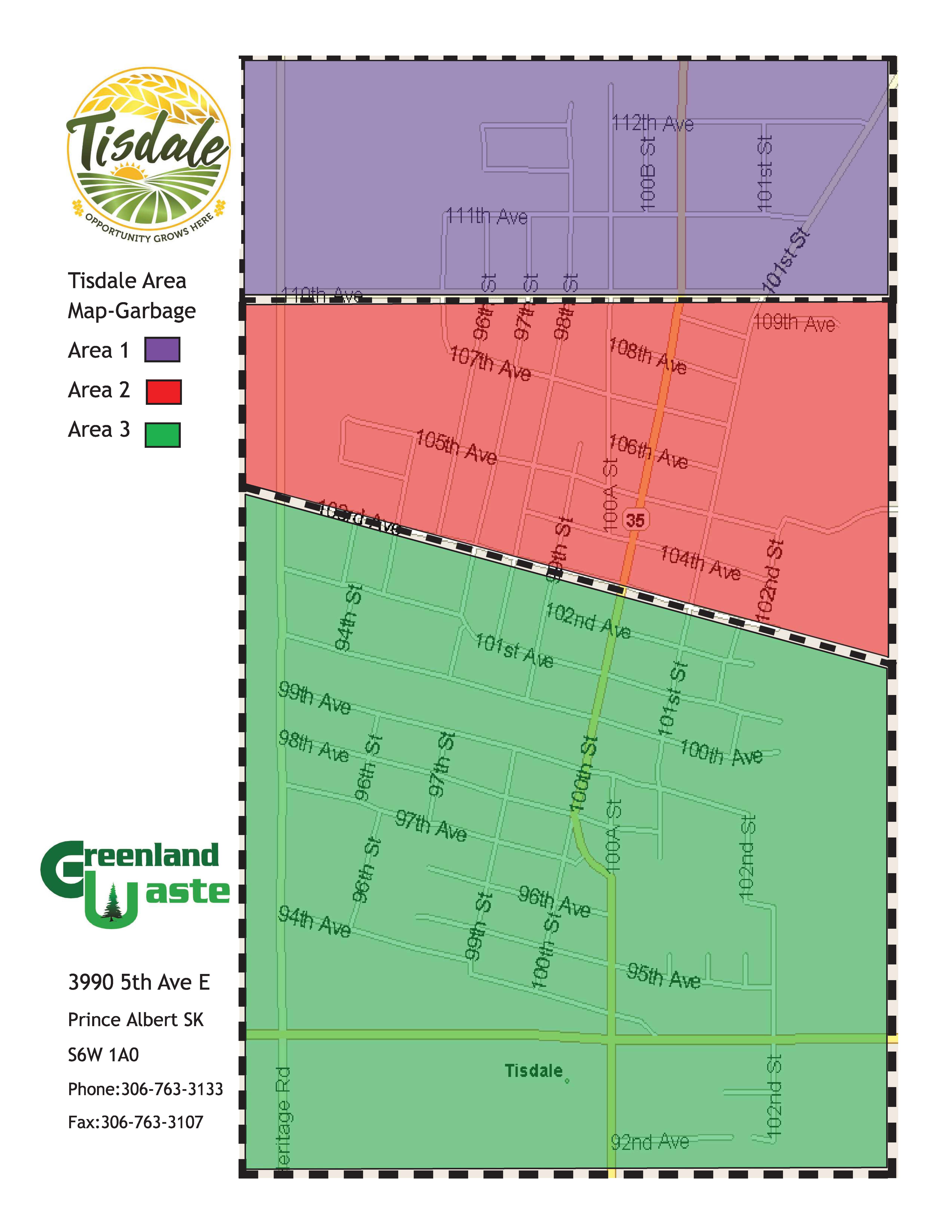 The Town of Tisdale offers a weekly garbage pickup from residential areas. The community is divided into three (3) services areas as shown below:
